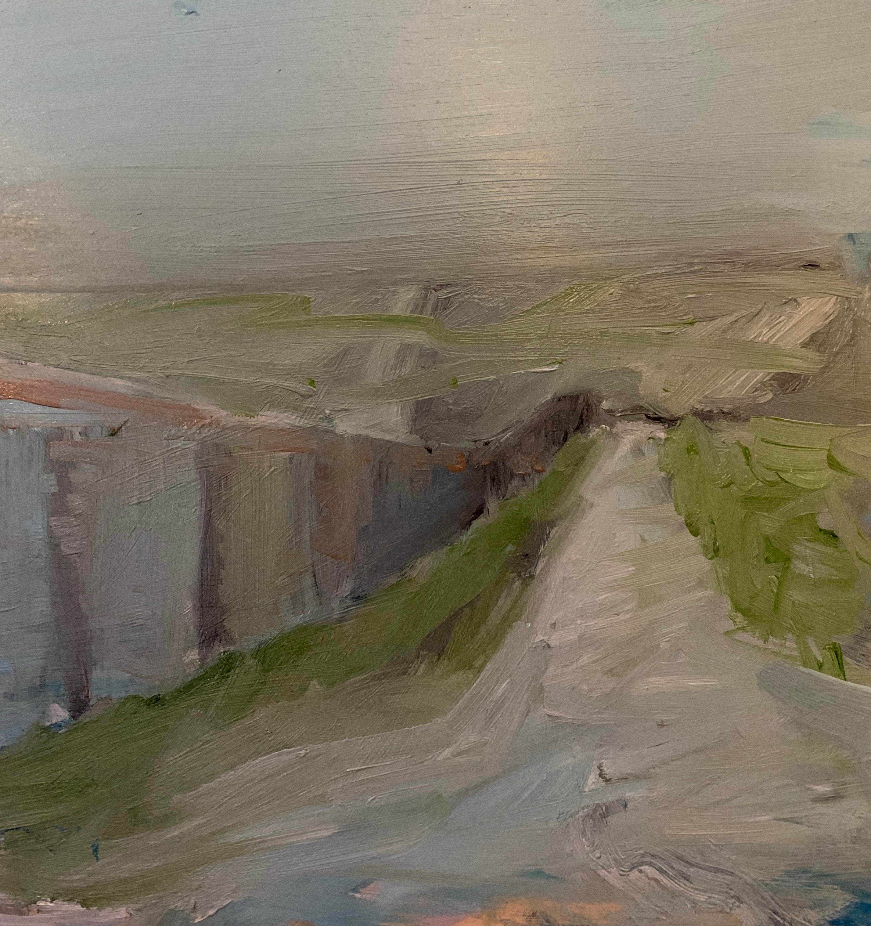 Ghost Mountain 12×14 acrylic on wood panel 2025 The volcanic mountains along the fjord have low-lying clouds and also high elevation, which causes the rising air to cool rapidly, and water vapor to form mist. So mountains may appear and disappear several times in any day, sometimes hovering as ghosts might, the Arctic air spooning around it.Red land, oil on wood 12 x 12 2024