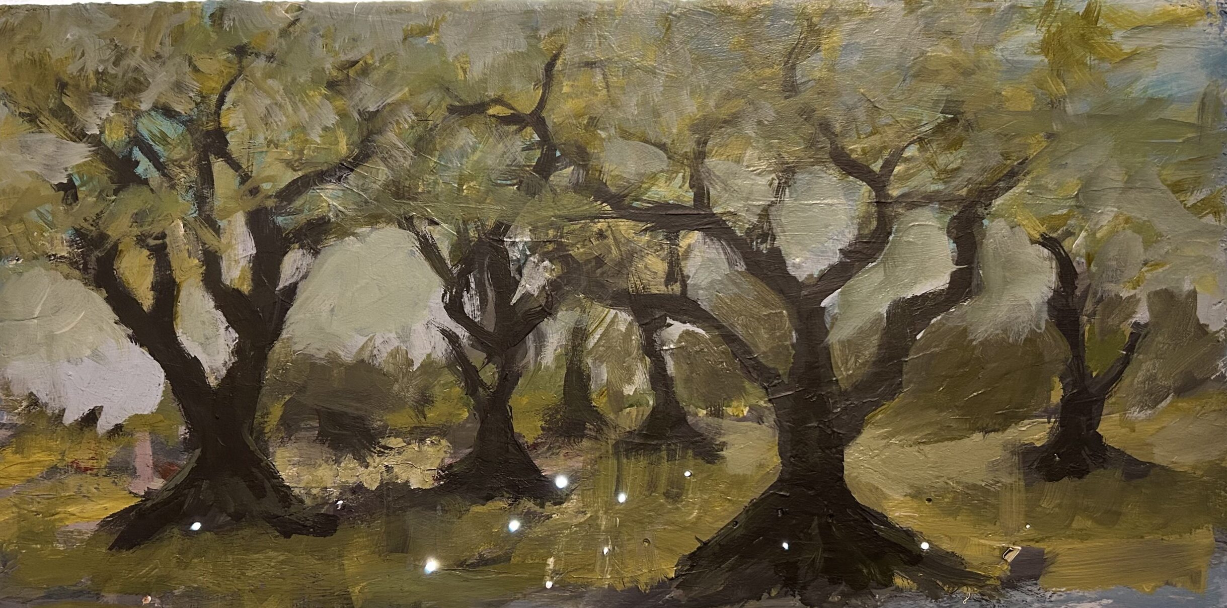 olive trees with spirits, acrylic on wood, 12 x 24″, 2025ruins with spirits, acrylic on wood, 12 x 24″, 2025border-wall at sunriseoil on board, 9×12wall at dawn oil on panel 24 x 37 2022